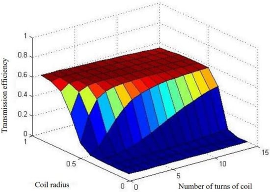 Figure 29, it can be seen that the maximum transmission efficiency is achieved when the number of turns of the coil is 8 or 9. Considering that increasing the number of turns will reduce the transmission power, the number of turns of the coil is taken to be 8, and the simulation transmission efficiency is 58.5% at this time.