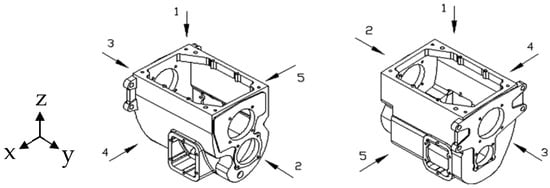 An automobile gearbox housing with five numbers indicating five machining orientations respectively.
