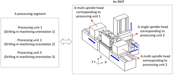 The mapping relationship between a processing segment and its corresponding RMT is shown in Figure 3. An RMT is usually composed of multiple processing units corresponding to various machining orientations. For each processing unit, a single spindle head or a multi-spindle head may be used to complete different types of machining operations such as drilling, boring, tapping, etc.