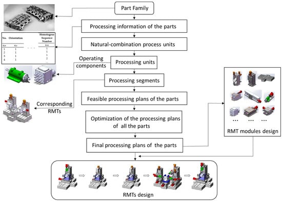 In order to realize rapid processing conversion among the parts in the part family, the processing plans for all the parts in the part family must be optimized and selected as an important basis for the RMT design. Then, based on the design of the RMT module groups for the production of a specific part family, RMT structure schemes can be generated according to their processing function requirements. A general scheme of the design methodology of reconfigurable machine tools is shown in Figure 4.