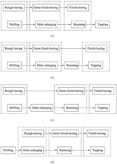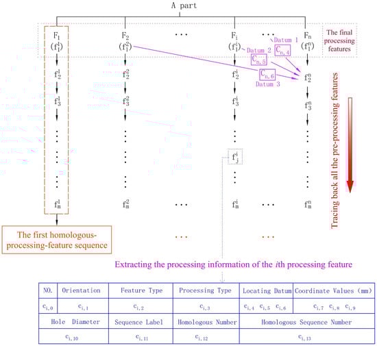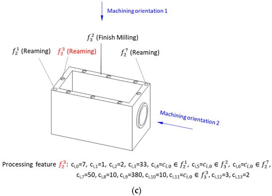 The third step is to create a processing information table for the machined part. Here, it is specified that the table is created for each single value, as shown in Figure 6, which contains the processing information for the processing features. Fourteen kinds of processing information, which are represented by numbers, are included in each row. Among them, ci,0 represents the code of a processing feature, ci,1 indicates the machining orientation corresponding to the processing feature (ci,1 = 1, 2, …, 7), 1~6 represent the machining orientations along the coordinate axis in the Cartesian coordinate system, respectively, and 7 represents the oblique machining orientation that is inclined to the coordinate axis. Figure 1 illustrates an automobile gearbox housing with six machining orientations. ci,2 is the feature type code (=1 means plane machining and =2 means inner surface machining, mainly for various hole machining such as unthreaded hole machining, threaded hole machining, etc.). ci,3 is the processing type code (=11 means the rough milling, =12 means the finishing milling, =21 means the rough boring, =22 means the finish boring, etc.). The codes ci,4, ci,5, ci,6 represent three locating datums of a processing feature, respectively; that is, the codes correspond to other processing features used as the locating datums, and if the locating datums of rough processing features are non-processing features, the codes are assigned values of 0. ci,7, ci,8, ci,9 are the X, Y, and Z coordinate values of a processing feature in the overall coordinate system respectively. If the processing feature is a hole-machining feature, ci,10 represents the diameter value of the hole; otherwise, it is assigned a value of 0. ci,11 corresponds to a processing feature that must be processed before the current processing feature according to the basic principles of the processing sequence, which expresses the processing sequence relationship between the two processing features. Code ci,11 is also called the sequence label. The homologous processing feature sequences are represented by numerical symbols. Code ci,12 is the numerical symbol of the homologous processing feature sequence to which the current processing feature belongs. Code ci,13 is the processing sequence number of the current processing feature in its homologous processing feature sequence. For example, the homologous processing feature sequence mentioned above includes the three processing features of rough boring, semi-finish boring, and finish boring; their codes, ci,13, are 1, 2, and 3 respectively such as in an example shown in Figure 5c. The processing information table of the part will be used as the basis for its process planning.