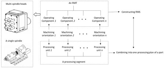 RMTs can be split into a set of autonomous functional modules that can be plug-and-play interfaced to form complete systems for particular needs []. In order to realize the rapid reconstruction of the structures and functions of RMTs, each autonomous functional module should have a specific processing function such as performing a definite machining operation. For an autonomous functional module with processing functions, the component that performs the machining operations may be a single spindle head or a multi-spindle head. On an RMT, there may be multiple operating components corresponding to the processing units of a processing segment of a machined part, and they operate in parallel and enable the RMT to achieve high-efficiency processing like a dedicated machine tool.