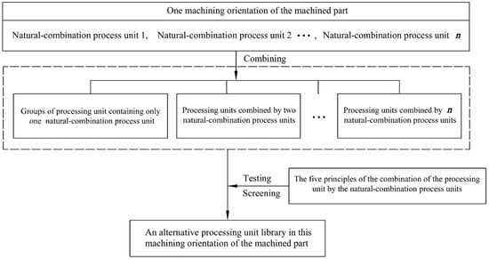 All feasible processing units must be created in each machining orientation of the part, and the processing plans of the part must be generated from these base elements. The processing units can be created through ergodic combination of the obtained natural combination process units by means of retrieval. Assuming that the number of natural combination process units in one machining orientation of the machined part is n, each natural combination process unit can be considered independently as a processing unit, followed by two combinations, three combinations, …, n combinations. Next, all feasible processing units meeting the five principles of the combination of the processing units by the natural combination process units can be screened out, and they can form an alternative processing unit library, shown in Figure 9.