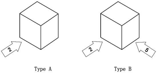 For example, as shown in Figure 10, two types of parallel machining orientation combinations are represented by A and B, respectively. If the original type B is converted to a new type A because type B contains all the machining orientations of type A, the original RMT corresponding to type B does not need to change its machining orientations and can directly meet the new parallel machining orientation requirements, and, after calculation, their similarity coefficient is 1. However, if type A, as the original type, is converted to type B, the original RMT needs to add a new machining orientation to meet the new processing requirements, and, after calculation, their similarity coefficient is 0.5.