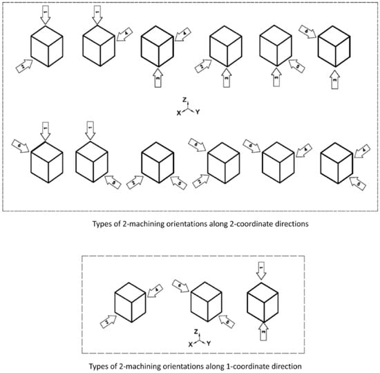 As shown in Figure 11, when the part is machined in 2 parallel machining orientations, there are 2 major categories corresponding to 15 types of parallel machining orientation combinations, which contain 12 types of 2-machining orientations along 2-coordinate directions and 3 types of 2-machining orientations along a 1-coordinate direction.
