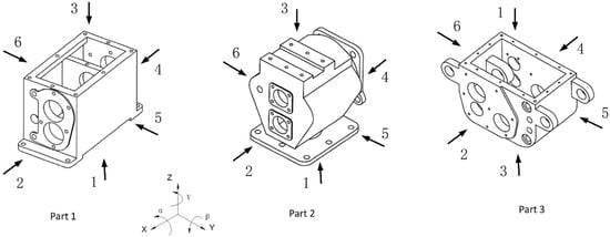 Taking the production of a gearbox part family consisting of three parts as an example, as shown in Figure 13, the proposed method was used to create reconfigurable manufacturing processing plans for their processing. In order to improve the processing efficiency, in this application example, RMTs were equipped with as many multi-spindle heads as possible. The machining orientations of each part were represented by numbers 1 to 6 (shown in Figure 13). The steps to create reconfigurable manufacturing processing plans for the processing of the part family were as follows: