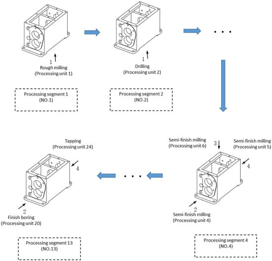 In the above three processing plans, the symbol “-” is the delimiter between two adjacent processing segments. Processing units are indicated by numbers, and the numbers in the parentheses indicate a set of processing units that belong to one processing segment. The processing segments of each processing plan are arranged in the order of processing. The processing information of the three parts’ processing plan is shown in Table 4, and the schematic diagram of the processing information of the processing segments in the plan of part 1 is shown in Figure 14. RMTs should be designed according to the three processing plans of the three parts, and the designed RMTs can be reconstructed and adjusted rapidly to realize the processing conversion of the three parts.