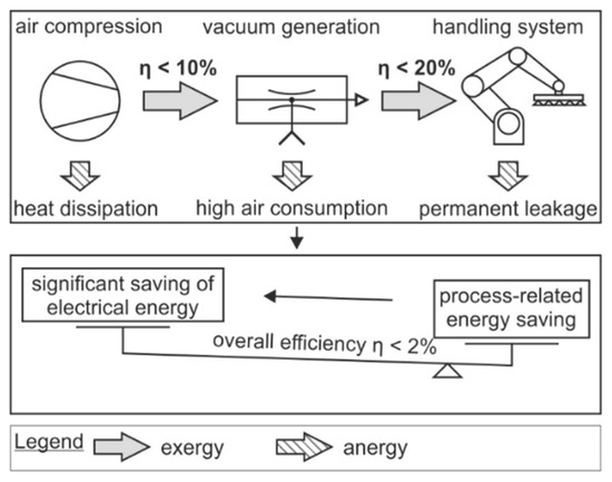By this calculation scheme, depending on the specific leakage rate, the exact air consumption of arbitrarily configured gripping systems can be predicted with regard to a given process duration and the defined pressure difference values. Since the gripping system parameters are varied regardless of compressed air generation, in the proposed method, potential energy savings are approximated by the achieved savings in compressed air consumption.