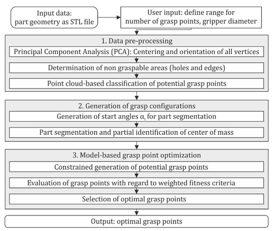 Figure 2), the part geometry is input to the algorithm as STL file. Since the STL file may be generated by a 3D scan, the geometry can potentially be oriented arbitrarily in space and must therefore be centered and re-oriented, which is realized by a principal component analysis (PCA). This step also comprises a projection of the 3D geometry to a 2D polygon, as a simplification for shell-like parts such as car body sheet metal parts. Such parts have a large area of a low thickness and mostly only local three-dimensional surface geometries, such that the macroscopic geometry is still most similar to a plane. The optimization procedure begins with the identification of the graspable area. This excludes edges and holes from the overall part geometry. In addition, potential grasp points in the graspable area are classified with regard to the main geometry (e.g., cylinder or dome) in order to estimate the achievable holding force within the optimization procedure. After these preparatory steps, the part geometry is divided into