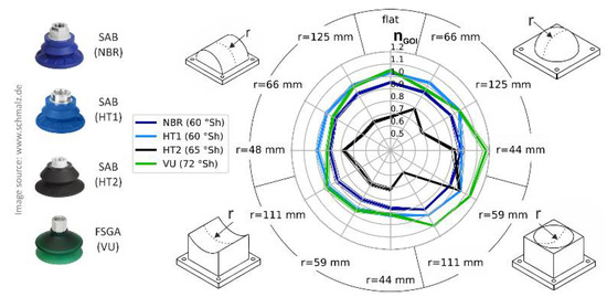 The experiments were conducted with one exemplary vacuum gripper with 1.5 foldings, made of SAB 60 nitrile butadiene rubber by J. Schmalz GmbH (Glatten, Germany). Since vacuum-based handling is extensively used in handling of sheet metal, e.g., in press shops in the automotive industry, a mean roughness range of 0.4 µm ≤ RZ ≤ 15 µm is taken into account, as this range is usually resulting from typical forming techniques such as deep-drawing [