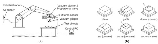 Resulting from the fabricated and grinded test objects, 24 different test objects are available for experiments (six object geometries, four roughness values). The objective of the experiments is to determine the maximum holding force. Firstly, the gripper is fully attached to the test object, evacuated by the used vacuum ejector and then pulled off completely at a velocity of 10 mm/s (in orientation to the test velocity for tensile testing of rubber [