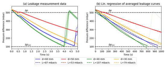 Figure 7b). For simplification, a linear regression was applied to these profiles to determine the leakage rate for the four different grippers in combination with the attached dead volume.