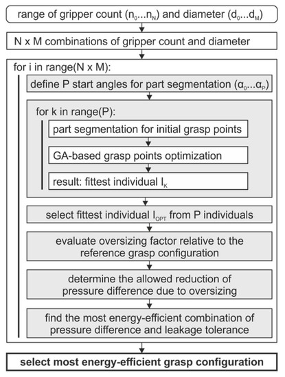 M combinations, the grasp optimization is conducted. Subsequent to the grasp optimization, for each grasp configuration it is evaluated to what extent it is oversized relative to the reference grasp configurations. For example, if the gripper count is doubled relative to the reference configuration, the oversizing factor is 2. Hence, the target pressure difference could potentially be reduced to the half, since this would yield the same holding force. In combination with the target pressure difference, the leakage tolerance (i.e., the allowed drop in pressure difference, before the ejectors is operated again in order to reach the initially targeted pressure difference) can also be adjusted within the allowed range that is limited by the oversizing factor. By means of the gripper-specific leakage information and the calculation scheme for determining the air consumption depending on pressure difference