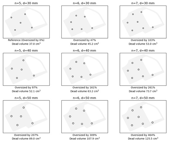 The third fitness criterion considers the gripper-object-specific values for nGOI and aims to maximize the achievable holding force for a given amount of grippers with a specified diameter (Equation (3)). The values of nGOI, that are specific to each possible grasp point within the graspable area, are provided as list to the algorithm.