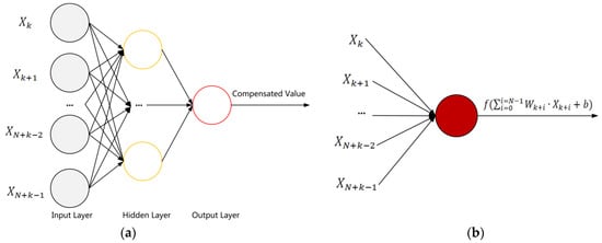 The compensation model used in the scheme is described in Figure 3. The compensated value is output through the MLP model, which is a simple neural network that includes an input layer, a hidden layer, and an output layer. The sampled continuous data are sent into the input layer, processed through the hidden layer with neuron model shown in Figure 3b, and then the compensation value is output. The output of a neuron can be expressed as , in which is the input vector, and are the weight and output bias to be trained and obtained, and is the activation function.
