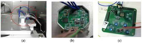 Experimental equipment for data collection: (a) the sensor in a thermostat; (b) signal preprocessing circuit; (c) circuit for digital signal acquisition and output.
