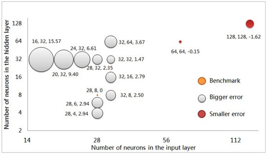 For the influence of the network parameter scale on the results, the parameter settings of the model were changed, and the error peak-to-peak value was used as an indicator to test the fitting effect. The compensated peak-to-peak value of and is taken as the comparison benchmark, and the increased ratio of the values, compared to the benchmark value under different parameters, is displayed in the bubble chart shown in Figure 6.
