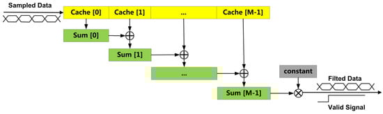 The collected signal from the sensor is 16-bit signed integers, which are expanded to 32 bits to reduce the effect of rounding errors in the calculation of fixed-point number multiplication. The sampled data are preprocessed by the moving average filtering circuit, and the implementation scheme is shown in Figure 7. The length of the filtered sequence is , and registers are contained in the circuit, in which the sampled data and the intermediate value of the summation calculation are cached, respectively. After the new data are sampled, the original cached data are stored at the next address, in turn, the last data no longer need to be stored, and the sampled data at this time are stored in the first position of the register array. The results of the summation calculation are updated at each sampling time.