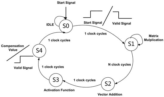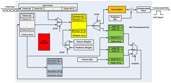 The data path and the control path of the MLP processing circuit are shown in Figure 8 and Figure 9, respectively. A finite state machine is used to process five states (S0, S1, S2, S3, and S4) in the calculation process. The cached data from the moving average filtering circuit are read in the S0 state, the matrix multiplication and the summation of the output bias of the hidden layer is performed in S1 and S2 states, respectively, the output activation of the hidden layer is performed in the S3 state, and the calculation of the compensation data of the output layer is performed in the S4 state. The multiplier array is multiplexed during hidden layer calculation and output calculation, and its input operands are selected by a multiplexer, and the selection signal is determined according to the current state from the finite state machine. The data of the feature matrix are updated through a multiplexer. The data derive from hidden layer matrix multiplication, bias addition, and activation function, and the selection signal is determined according to the current state.