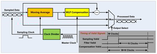 The frequency of the sampling clock and the master clock of the circuit are denoted by and , respectively. In order to streamline the compensation processing of the sampled data, the moving average circuit and MLP processing circuit need to complete data processing and data output in each sampling period. According to the above requirement, the required clock frequencies of the moving average filtering circuit and the MLP processing circuit are and , respectively. The following relationship between the sampling clock and the master clock is established: