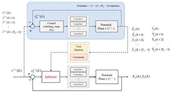 Because the performance of the switching control structure can be significantly influenced by the structure parameters, we propose a method to tune these parameters. As shown in Figure 1, the response predictor estimates future system responses by all possible control sequences, and selects the optimal control sequence that minimizes certain system costs. Suppose that there are N controllers, and the number of controller switching steps is Sp; the number of possible control sequences is then . For instance, suppose that two controllers—C1 and C2 (i.e., N = 2)—have two switching steps (i.e., Sp = 2); there will be 22 = 4 possible control sequences, as follows: (C1, C1, C1, …, C1), (C1, C2, C2, …, C2), (C2, C1, C1, …, C1), (C2, C2, C2, …, C2). Therefore, the predictor needs to calculate the system responses employing these four control sequences, and then choose the optimal control sequence that minimizes certain performance indices.