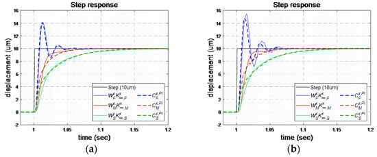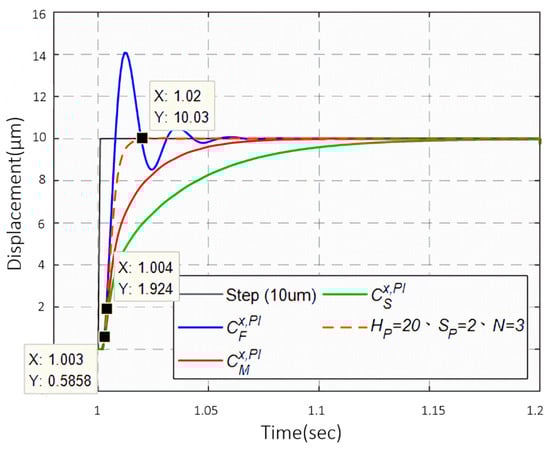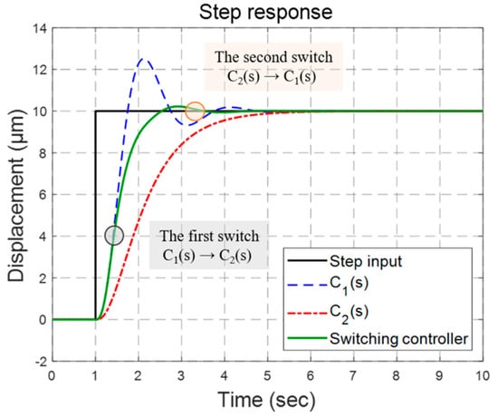 We applied the iteration procedures (see Figure 3) to derive the optimal parameters for the switching control mechanism. The processes are shown in Appendix C, where the optimal parameters were . Therefore, we implemented these parameters in the PZT stage employing the multiple control structure, and we illustrate the system responses in Figure 6. At t = 1 s, the stage began to track a step command of 10 μm with the fast controller . Based on the response prediction, the switching mechanism switched the controller to at t = 1.003 s, and to at t = 1.004 s. Finally, the fast controller was chosen at t = 1.02 s to track the step command. As shown in Figure 6, the switching control combined the merits of these controllers to achieve a fast and smooth response.