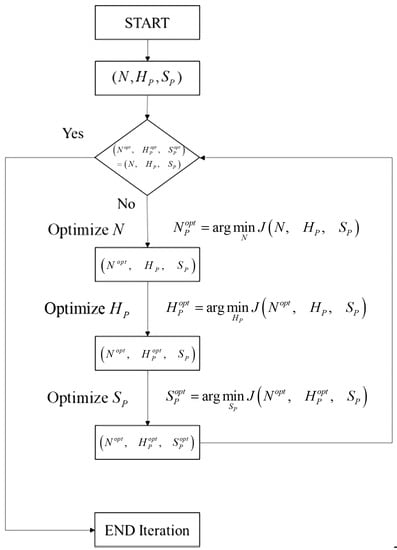 Although the control parameters can significantly influence the system performance, simultaneous optimization of these parameters is impractical because of the hardware computing loads. For example, the predictor needs to estimate the future system responses in the next Hp steps with control sequences. Therefore, we propose an iterative method that can tune these parameters one by one at each iteration until they converge. For example, suppose that we have three structure parameters , where N is the number of controllers, Hp is the prediction horizon, and Sp is the number of switching steps. The proposed iteration procedures are illustrated as follows (see Figure 3):