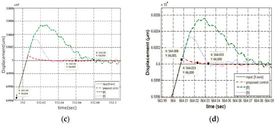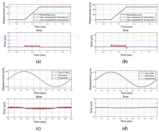 We applied the motor stage for tracking the ramp and sinusoidal inputs. The results are shown in Figure 8 and Table 3. First, Figure 8a,b shows the tracking responses to the ramps of 100 μm/s and 500 μm/s, respectively. The gain-scheduling control was set as Kp = 400, because the tracking errors were less than 10 μm. Compared to the control used in [], the RMSE was decreased from 2.4797 μm to 0.2238 μm for the ramp of 100 μm/s, and from 8.7794 μm to 0.7851 μm for the ramp of 500 μm/s. Second, the tracking responses for sinusoidal inputs of 0.1 Hz and 1 Hz are shown in Figure 8c,d, respectively. Similarly, the gain-scheduling control was set as Kp = 400, because the tracking errors were less than 10 μm. Compared to the control used in [], the RMSE was reduced from 0.5609 μm to 0.1355 μm for , and from 5.5460 μm to 0.4161 μm for .