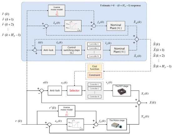 We integrated the PZT and the motor stage with the control structure, as shown in Figure 9, where the PZT stage applies the multiple switching control with , while the motor stage employs the gain-scheduling control with command feedforward. The response predictor also applies a similar layout to estimate the stage responses by all possible control sequences. The predictor then calculates the corresponding system costs and selects the optimal control sequence for the PZT stage.