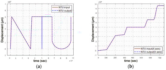 For experimental verification, we applied the combined stage to track the word “NTU” with a scale of 100 mm × 50 mm, as shown in Figure 10a. The experimental results are illustrated in Figure 10 and Table 4. Compared with previous works [,], the RMSE was reduced, because the multiple switching control can quickly adjust the tracking errors at the turning points, as shown in Figure 10c,d. For example, the switching mechanism switched the x-axis controller of the PZT stage from to at t = 331.990 s, and from to at t = 332.060 s. Finally, the intermediate controller was chosen at t = 332.080 s to complete the turning. Similarly, the switching mechanism switched the controller from to at t = 564.008 s, from to at t = 564.023 s, and from to at t = 564.033 s to complete tracking the turning point. Compared with previous studies [,], parameter optimization of the switching control led to significantly improved system performance.