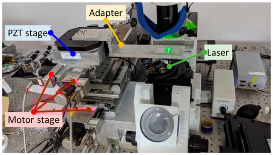 We integrated the combined stage with a TPP system, as shown in Figure 11 to fabricate a microlens. An adaptor with a microscope slide was connected to the PZT stage, and the laser was projected to fabricate microstructures by hardening the materials (OrmoComp) on the microscope slide. Note that the adaptor and the microscope slide were put on the stage when we identified the PZT stage models in Equation (2). Furthermore, the model variation caused by the loading effects can be neglected because the adaptor is lightweight. We demonstrate the effectiveness of the proposed control method using the images and optical properties of the microlens.