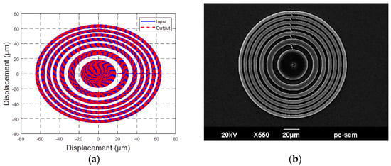 where n is the number of circles, rn is the radius of the n-th circle, is the wavelength in μm, and f is the focal length of the lens in μm. For example, setting n = 13, = 632.8 nm, and f = 500 μm, the radius is calculated as when . The design and fabrication results are shown in Figure 12.