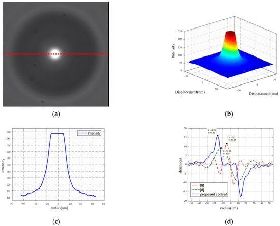 We evaluated the optical quality of the FZP by the light intensity and sharpness detected on the CMOS images. The FZP focused light onto a CMOS camera, as shown in Figure 13a, where the CMOS image was gray, scaled as black and white. Every pixel had a value of 0–255 to represent its brightness, as shown in Figure 13b, where 0 and 255 represented an image that was completely black and completely white, respectively. We analyzed the intensity of the image brightness along the red line, as shown in Figure 13c. The light sharpness was defined as the derivative of the intensity, as illustrated in Figure 13d. The tracking RMSE of the combined stage and the optical properties of the microlens are shown in Table 5. Compared with previous reports [,], the optical qualities of the microlens were greatly improved. The proposed multiple switching control employing iterative parameter tuning is therefore deemed effective in improving microfabrication.