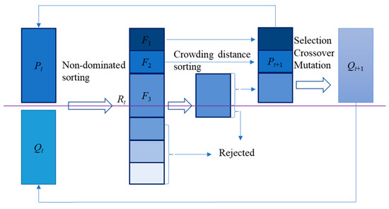 The elitist non-dominated sorting genetic algorithm (NSGA-II) is proposed by K. Deb [28], which improves the iterative convergence rate while ensures population diversity by employing the fast non-dominated sorting approach, elitist maintenance strategy and efficient crowding distance estimation method [29]. This makes it popular in solving complex optimization problems [30,31]. The principle of the NSGA-II algorithm is shown in Figure 1, and its basic steps are as follows: