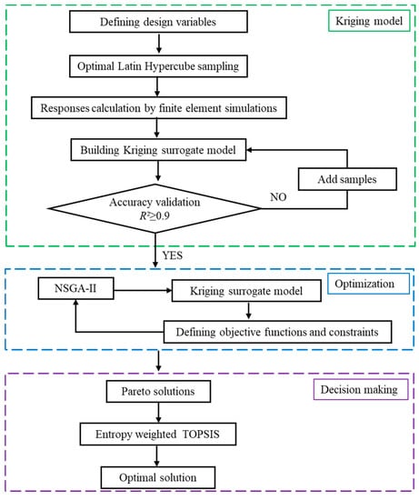 Generally, there are a large number of iterations for solving engineering optimization problems, making the optimization time-consuming, especially when the problem is complex. Surrogate model-based optimization provides an alternative approach for improving optimization efficiency [25,26,27], in which the Kriging model is one of the most used surrogate models because of its high accuracy for predicting nonlinear response.