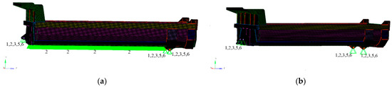 In the lifting load case, the constraints are the same as the full load case, except that a displacement of 10 mm is applied to the carriage lifting support point, which is adopted to simulate the critical separation state between the carriage and frame. Moreover, the y-direction translational constraint for the nodes in the contact area of carriage and frame is canceled. The constraint condition of the U-carriage in the full load case and lifting load case are shown in Figure 5.