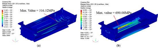 Stress contour: (a) Full load case; (b) Lifting load case.