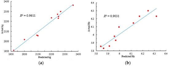 The range of R2 is [0,1], and the closer the value is to 1, indicating that the accuracy of the surrogate model is higher [38]. There are 10 sample points randomly selected from the sample points for accuracy validation. The determination coefficients of the surrogate models for the mass, the first-order natural frequency, the maximum stress of the full load case and the lifting load case are obtained, as shown in Table 4. The validation results for the mass and first-order frequency are given in Figure 9. Obviously, the Kriging surrogate models of the U-carriage exhibit sufficient accuracy.
