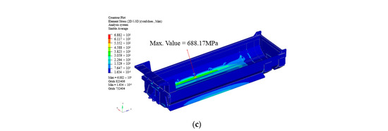 The design variables of the optimal solution are corrected according to practical engineering, and are listed in Table 7. Then, the finite element model of the dump truck carriage is modified and used to calculate the performance index. The first mode and stress contours of the full load case and lifting load case are shown in Figure 11. It can be seen that the stress distribution is improved compared with that before optimization. The mass of the U-carriage is reduced by 81 kg with a mass reduction of 3.7%, while guaranteeing sufficient performance, which achieves a significant lightweight. It is also proved the effectiveness of the proposed method for multi-objective lightweight optimization.