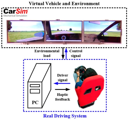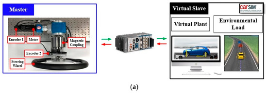 For driving simulator application that integrates vehicle dynamic simulation software such as CarSIM, the bilateral control system that enables human–machine and virtual–cyber interaction is made up of the steering mechanism called the master, and the virtual steering platform called the virtual slave. The main feature of a bilateral control system is the synchronous motion control whereby the virtual steering wheel has the same motion as the master. With the addition of pedals, the motion of a virtual car can be fully controlled by a human operator. The schematic setup of the driving simulator is depicted in Figure 1 where the driving sensation of a real car, mimicked by the virtual car, is generated by CarSIM and transmitted to the master to reproduce a corresponding haptic feel.