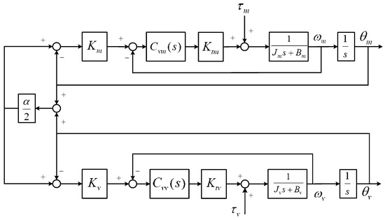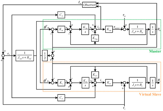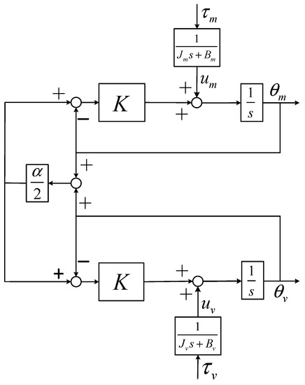 where τ and θ denote the external torque and position of the motor, the subscripts m and v denote the master side and the virtual slave, respectively. Equation (1) shows that torque from each side needs to be balanced in the steady state. Then Equation (2) shows that for synchronization motion, the position control loops of both master and slave should follow the position command given by: