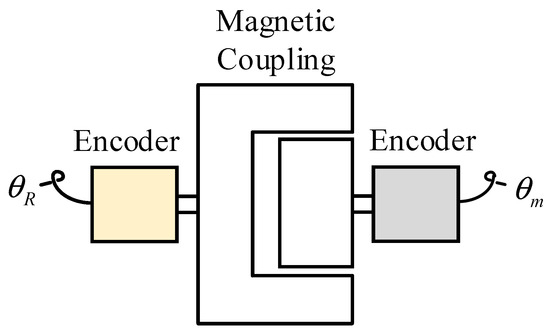 Magnetic coupling is a contactless and non-friction transmission mechanism that has a 1:1 gear ratio. Its contactless characteristic can be utilized in the steering system, such as [15] to provide transmission and smooth sensation compared to mechanical rigid contact couplings. The magnetic coupling also provides the function of overload protection for the situation while the motor driving torque is over the required safety. Because of the finite stiffness characteristic, the transmission torque of magnetic coupling can be easily measured by optical encoders as shown in Figure 6. A block diagram of the proposed transmission module for torque measurement is presented in Figure 7 where denotes the operator torque, and denotes the reaction torque reproducing haptic to the operator where is the stiffness constant of the coupling. As can be attained accurately using practical measurement, the coupling module is capable of detecting external reaction torque as follows: