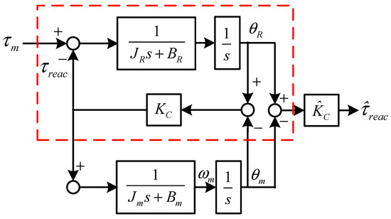Based on the magnetic coupling of Figure 7, the overall structure of the bilateral motion control system with magnetic coupling is shown in Figure 8 where the dynamic model of the magnetic coupling is represented by the Red dashed-line box. By using the estimated reaction torque, Equation (1) can be rewritten as: