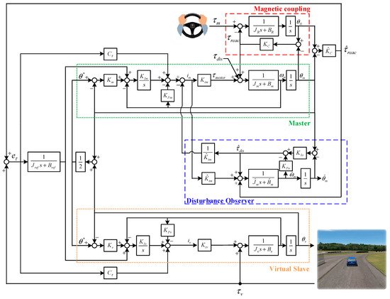 Unlike the reviewed literature, this paper presents a different approach to bilateral control system, which combines the magnetic-coupler torque sensing with a disturbance observer for realizing haptic feedback. Moreover, the magnetic coupling as a component, does not only connect the steering wheel with the actuator, but also measures the relative position between the driver and driven sides. Unlike the commonly used mechanical flexible transmission mechanisms, such as torsion springs [14,15], magnetic coupling does not have any backlash [16,17], and its contactless characteristic can also provide inherent overload protection. As a result, the reaction torque responsible for reproducing haptic sensations to the operator can be detected and accurately measured by the magnetic coupling transmission module. Also, due to its frictionless and the elastic nature of its torsional stiffness, the magnetic coupling can provide a quick and smooth sensation of the reaction torque when operated within the admissible torque range. Furthermore, this paper presents an appropriate control scheme to deal with the disturbance feedforward compensation. The reaction torque measured from the magnetic coupling is used in the disturbance torque observer to decouple the load torque information. The model inaccuracy and external disturbances appearing on the driving motor installed in the master side can be adequately observed and then compensated. The feasibility and effectiveness of the proposed method for improving haptic transparency in virtual reality applications were verified using a cyber-physical CarSIM driving simulator experimental system.