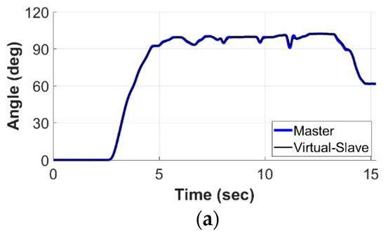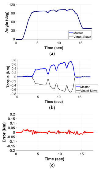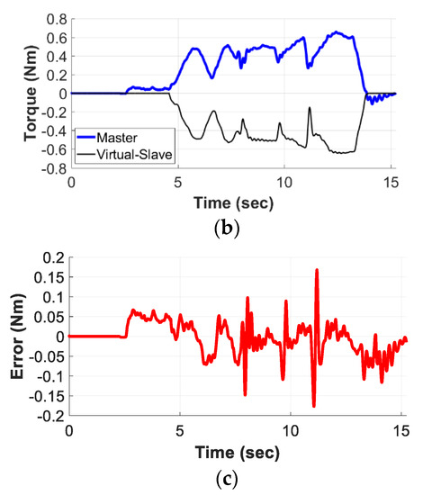 By implementing the proposed bilateral control system of Figure 8, the experimental results are as shown in Figure 11. As can be seen, similar to Figure 10a, the results show a great position tracking performance. Moreover, the measured haptic feedback by the proposed disturbance compensation is also tracked very well and is consistent with the virtual load as measured by the magnetic coupling transmission module. It can be found from the results of Figure 10c and Figure 11c that the torque error between and becomes much smaller (from 0.15 Nm to less than 0.05 Nm). This concludes that apart from the synchronous motion control between the real operator steering unit and the car moving simulation in the virtual reality system, as expected, the transparency of the haptic feedback can be effectively improved in the proposed bilateral control system.