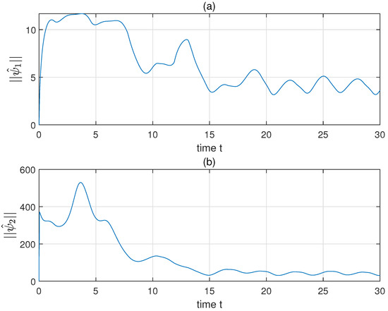 The performance of system parameters. Panels (a,b) show the trend of adaptive parameters and , respectively.