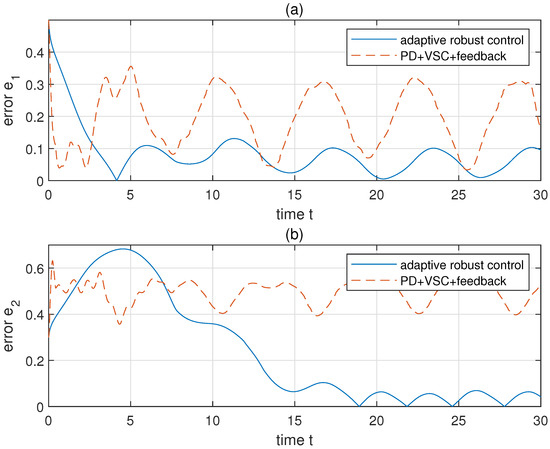 The comparison of errors under adaptive robust control and PD+VSC+feedback control. Panels (a,b) show the following error and of two links, respectively.