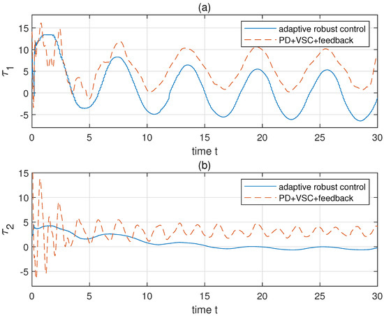 The comparison of toques under adaptive robust control and PD+VSC+feedback control. Panels (a,b) show the control cost and of two links, respectively.