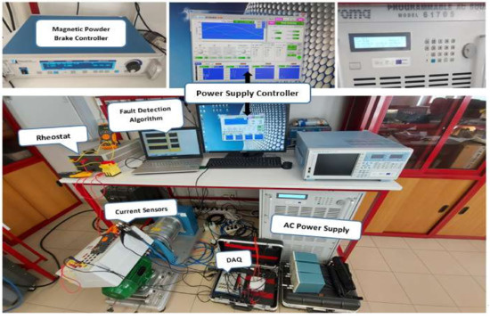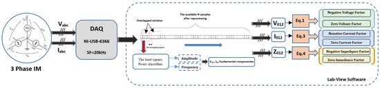 In order to implement the proposed method online, the algorithm used for generating the three unbalance factors was first developed using Matlab code, and then it was inserted into the Lab-VIEW software via the Matlab script mode. The other steps of the proposed method, such as filtering, down-sampling, and offset removing, were performed directly using Lab-VIEW palettes. The IM voltage and current signal measurements were performed through the use of Tektronix P5200A differential voltage probes and Tektronix TCPA300 amplifier + Tektronix TCP312 current probes, and the corresponding signals were acquired through the use of a NI USB-6366 series data acquisition card with a sampling frequency of 20 kHz. These steps were carried out continuously, which permits to follow, in real time, the evolution of the target indicators as well as the different motor quantities such as: voltages, currents, impedances, and the symmetrical components.