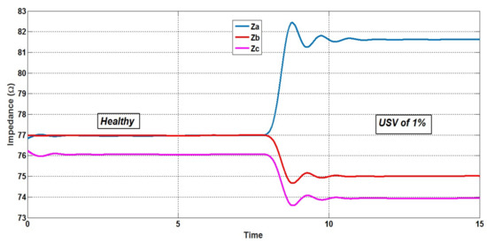 The induction motor was initially supplied with balanced voltages and after 1s, a very low voltage unbalance of 1% is introduced using a programmable power supply. Figure 4 shows the time evolution of the three-phase voltages and currents when a USV of 1% was introduced suddenly in one phase. Obviously, the effects of the unbalanced condition cannot be observed clearly. However, and thanks to the implemented algorithm, the three-phase impedances are online estimated and visualized (Figure 5). It has to be noticed that these impedances are calculated starting from the fundamental harmonics of the three-phase stator voltages and currents. As can be clearly seen, the curves depicted in Figure 5 provide a good physical interpretation of the USV’s effect on the stator winding impedances.